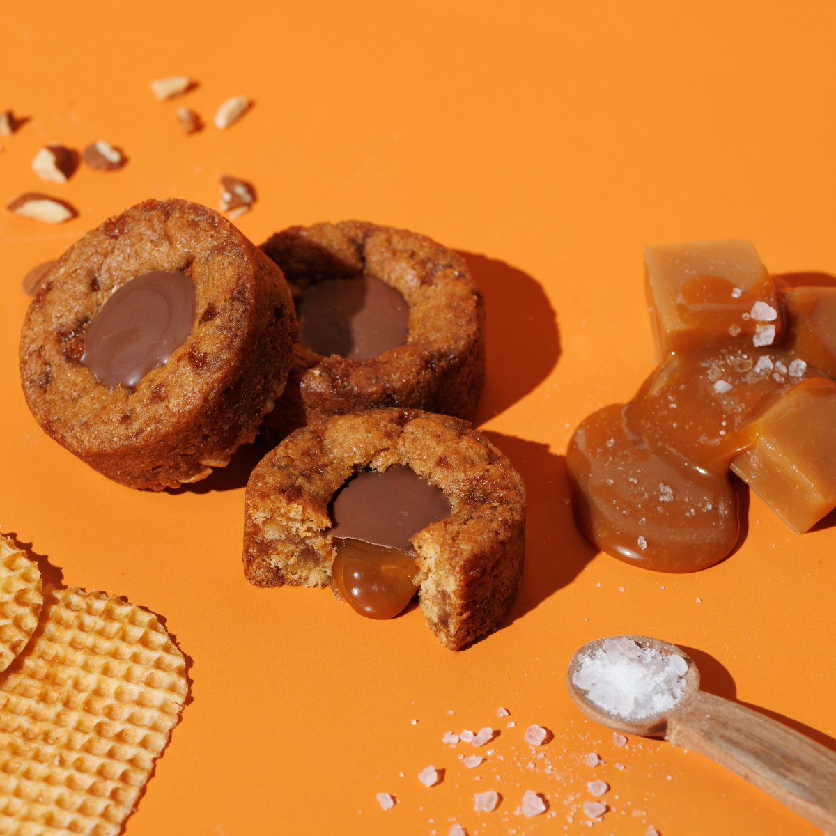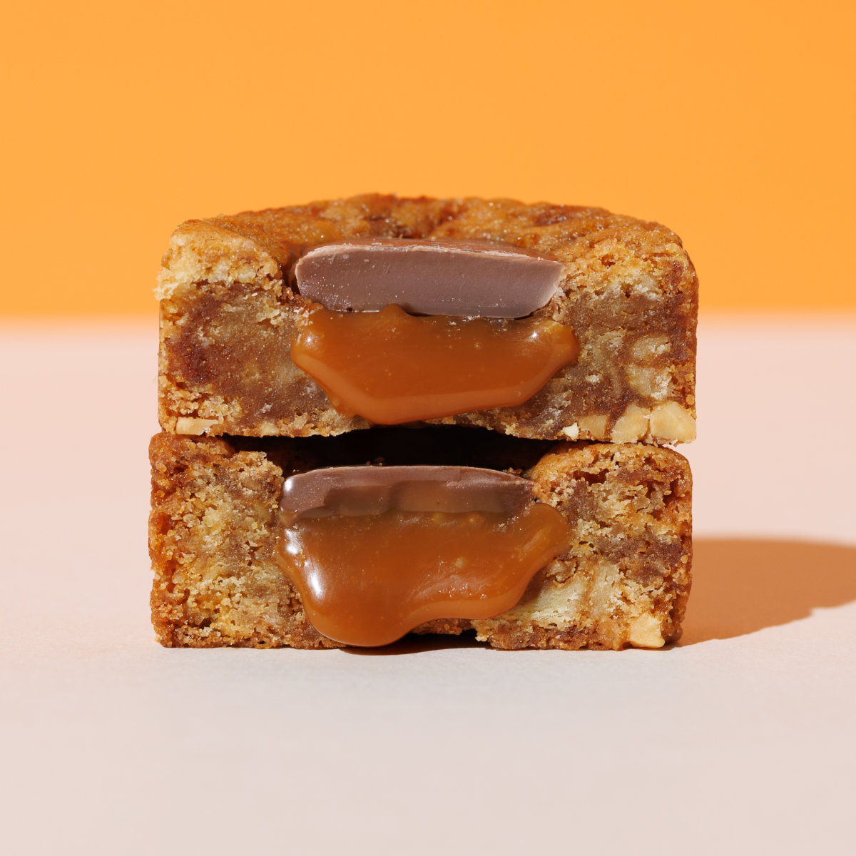 キャラメルチップ入りの生地とミルクチョコレートで閉じ込めました。